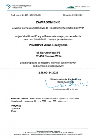 Firma ProBHP24 widnieje na oficjalnej liście instytucji prowadzących działalność szkoleniową BHP i PPOŻ – (RIS).